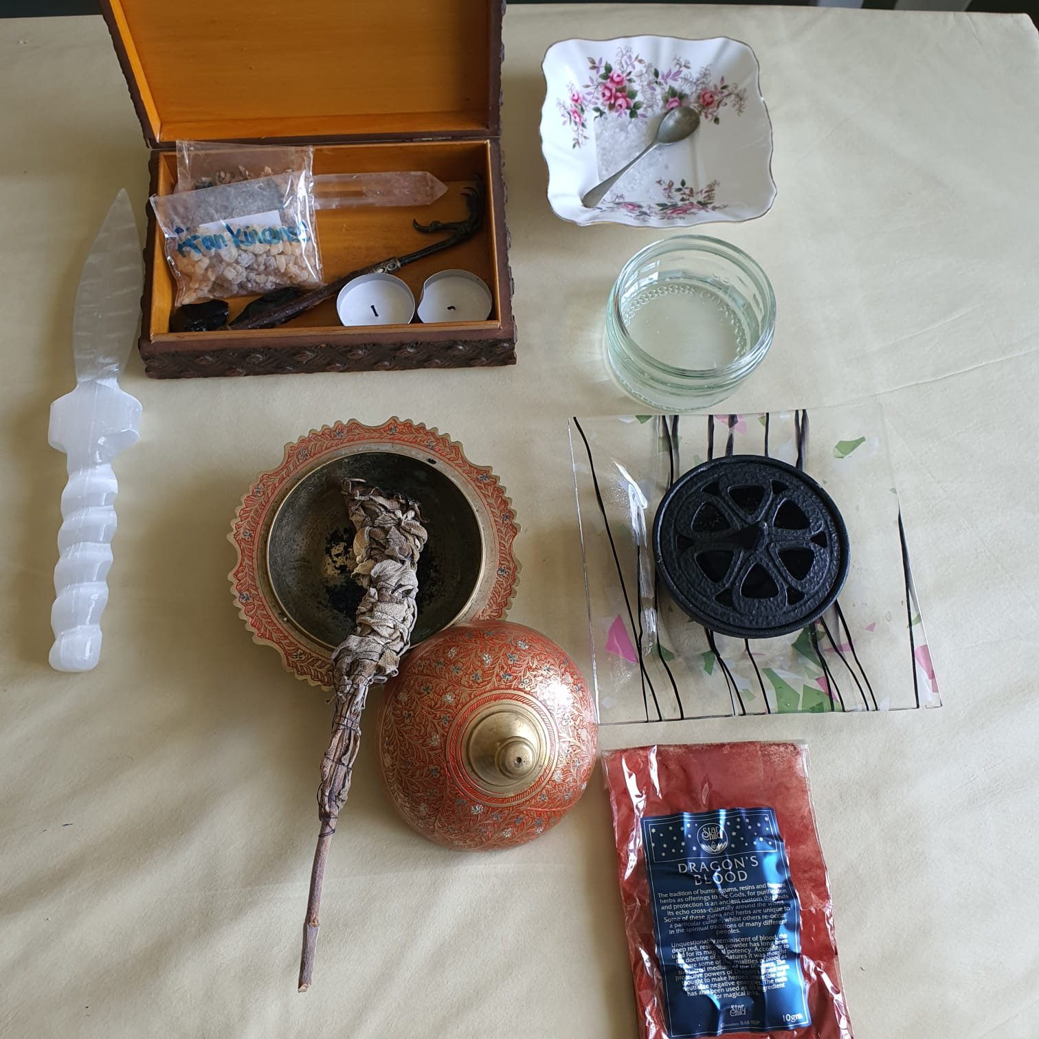 They can include - from top left clockwise: an athame (knife); Candles, plant resins - eg frankincense, myrrh and dragon’s blood; candles, crows claw and crystal, quartz crystal, obsidian shards; rock salt; energised water; crucible; smudging herbs. There are others too!